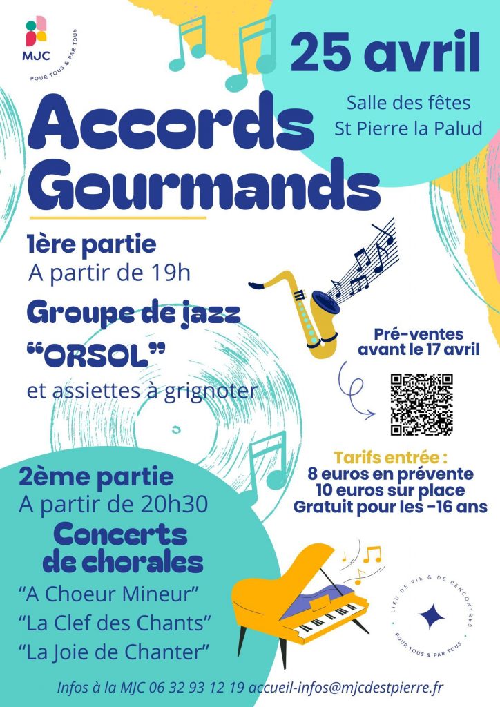 La MJC vous invite à une soirée pleine de rythme ! Dès 19h, dans une ambiance conviviale, dégustez nos planches gourmandes (charcuterie, fromages…) et laissez-vous emporter par les sons « jazzy » proposées par le groupe ORSOL. A 20h30, place aux voix : trois chorales — La Joie de Chanter, La Clef des Chants et À Chœur Mineur — vous feront voyager à travers un répertoire éclectique et entraînant : variété, gospel, chants africains… Une belle soirée en perspective, à partager sans modération !